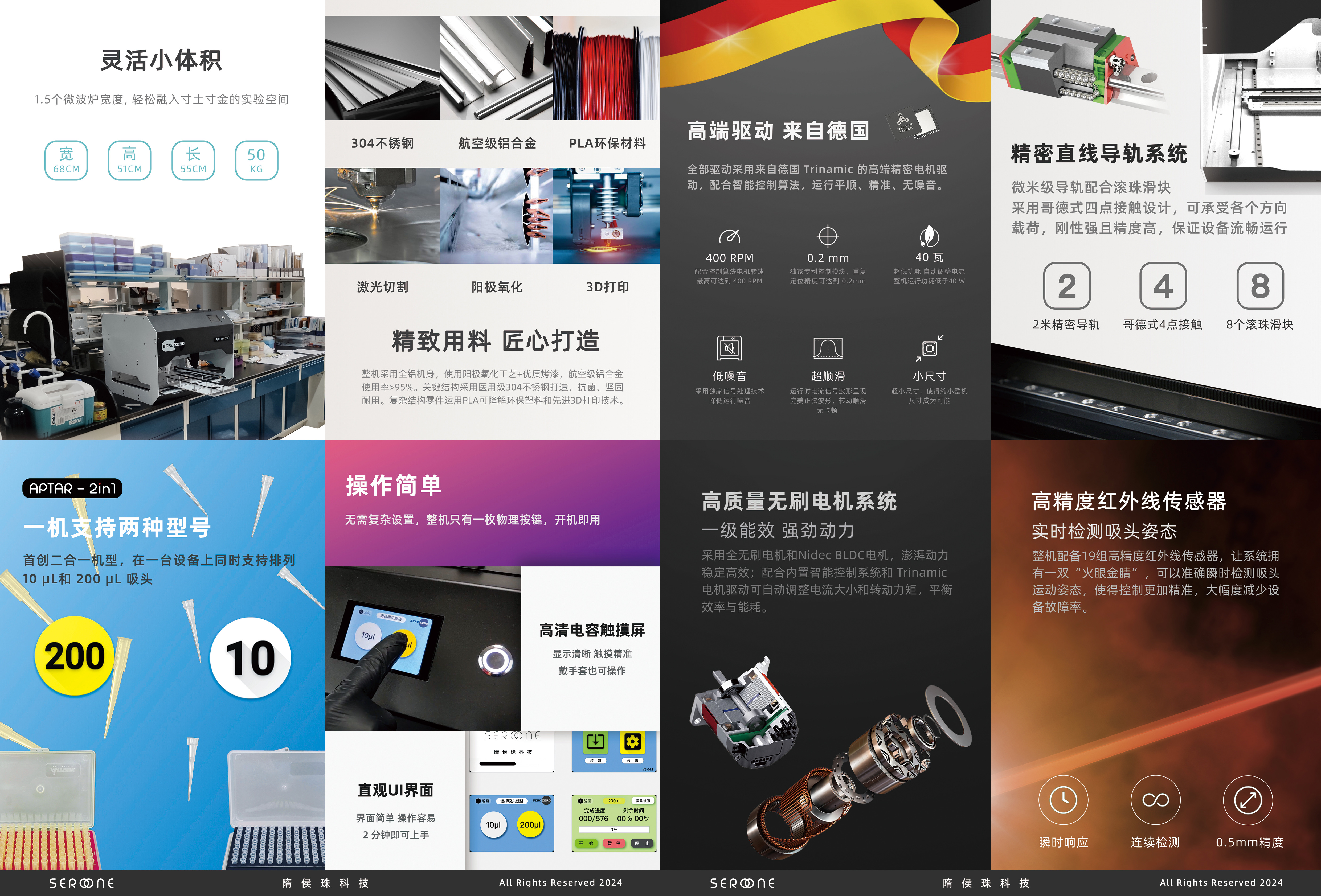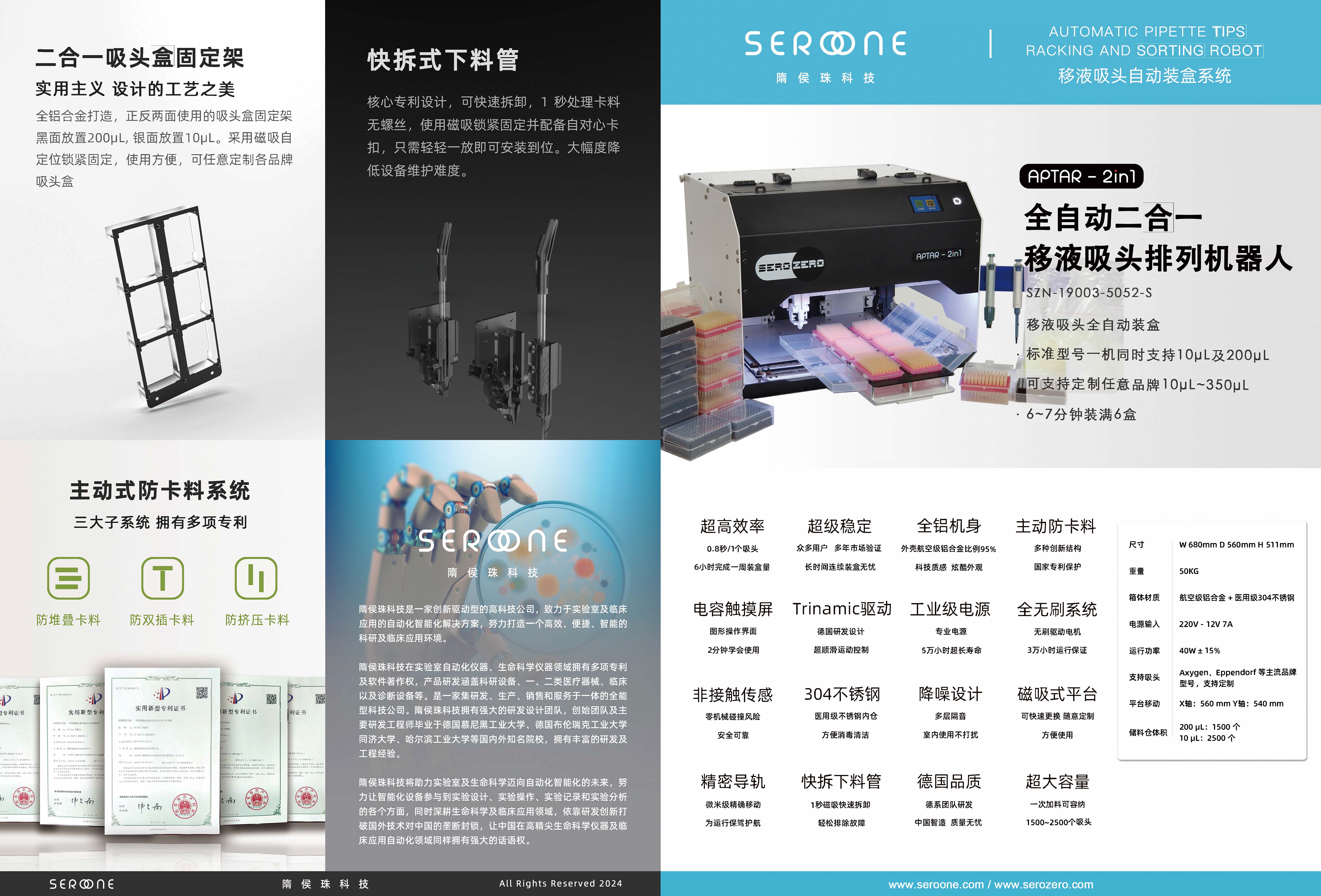 1. ✳二合一机型;在不更换硬件零件的情况下,一台设备可同时支持排列两种规格吸头,标准机型为一机同时支持10ul和200ul吸头;可支持匹配进口、国产等多种品牌吸头,支持10ul/20ul/200ul/250ul/300ul/350ul吸头中任意两种规格定制。