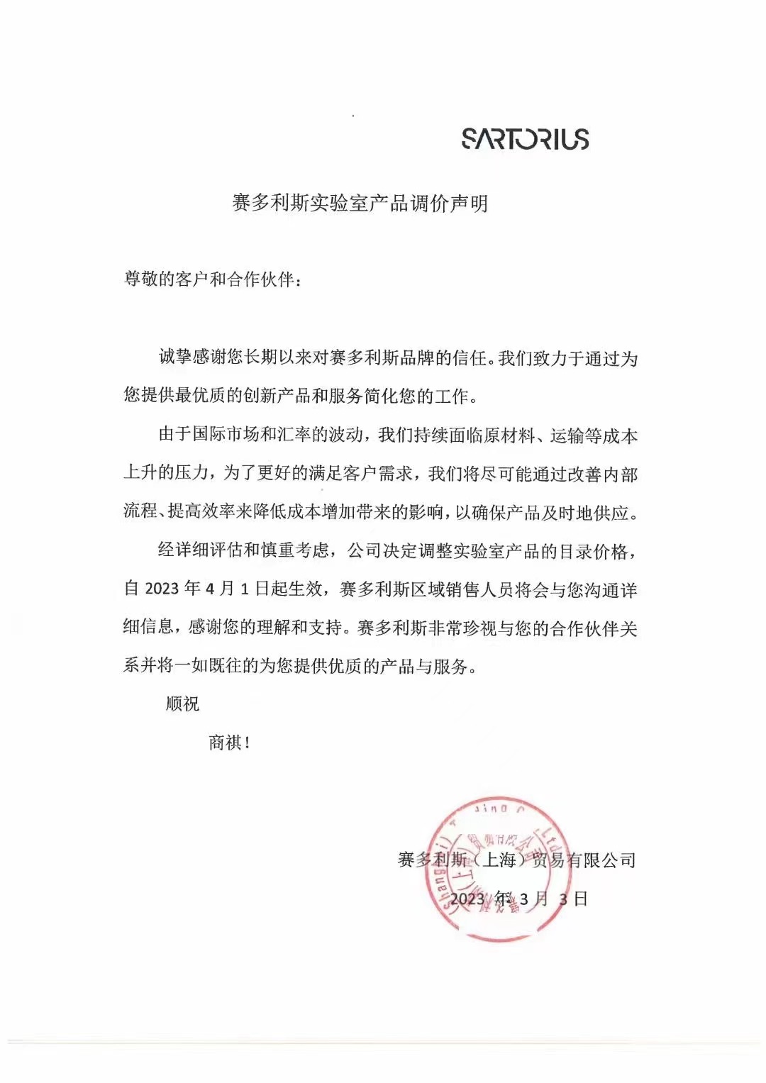 诚挚感谢您长期以来对赛多利斯品牌的信任。我们致力于通过为您提供最优质的创新产品和服务简化您的工作。由于国际市场和汇率的波动,我们持续面临原材料、运输等成本上升的压力,为了更好的满足客户需求,我们将尽可能通过改善内部流程、提高效率来降低成本增加带来的影响,以确保产品及时地供应经详细评估和慎重考虑,公司决定调整实验室产品的目录价格自2023年4月1日起生效,赛多利斯区域销售人员将会与您沟通详细信息,感谢您的理解和支持。赛多利斯非常珍视与您的合作伙伴关系并将一如既往的为您提供优质的产品与服务。顺祝商祺!