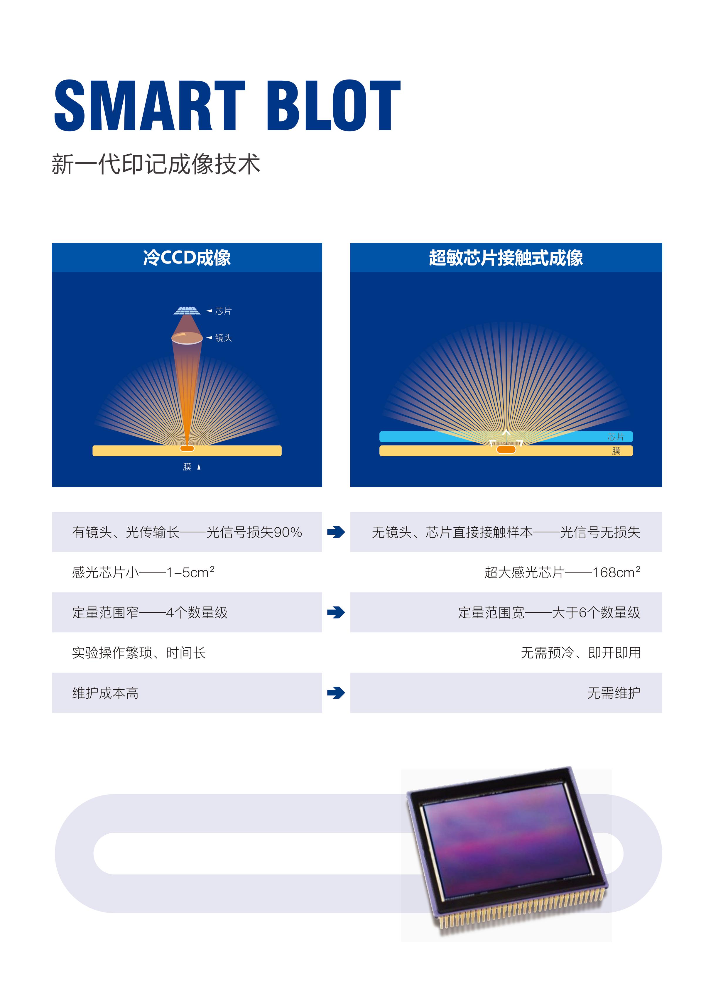 产品概述: Smart Blot系统采用前沿的超敏芯片接触式成像技术,颠覆了传统冷CCD成像的局限,显著增强了蛋白检测的灵敏度与便捷性。它通过无镜头设计,实现了光信号零损失,直接接触样本,确保了检测信号的纯净与强度。系统配备的超大感光芯片,面积达168cm²,远超传统设备,能够捕捉更广泛、更微弱的信号,定量范围超过6个数量级,极大拓宽了实验应用的边界。