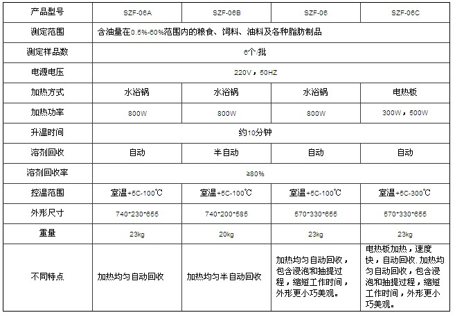 F-06系列脂肪测定仪主要有加热抽提,溶剂回收和冷却三大部分组成。操作时可以根据试剂沸点和环境温度不同而调节加热温度,试样在抽提过程反复浸泡及抽提,从而达到快速测定目的。
